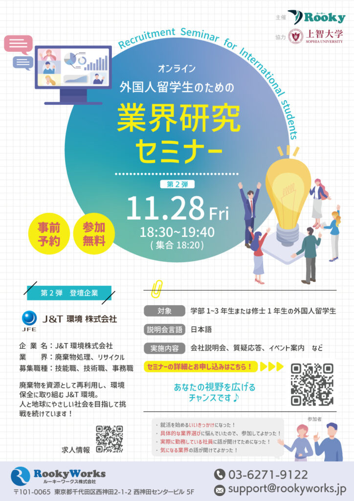 上智大学様共催 外国人留学生のための「業界研究セミナー(J&T環境株式会社)」が実施されます!