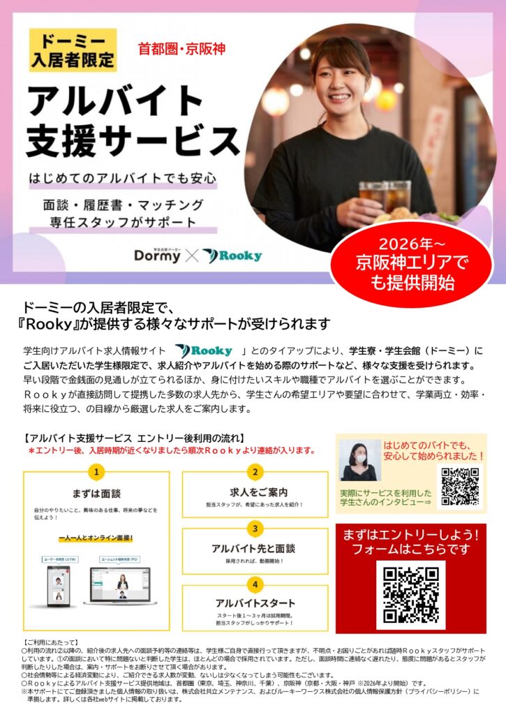 株式会社共立メンテナンスとルーキーワークス株式会社は、学生寮・学生会館(ドーミー)入居者限定の 「アルバイト支援サービス」 を、2026年より 京阪神エリアへ新たに提供開始いたします。