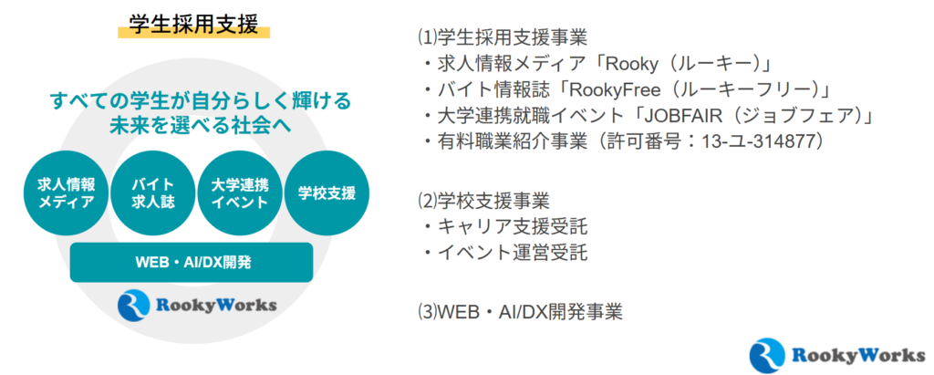当社は学生採用支援事業の一環として、求人情報メディア運営・就職イベント運営等に加え、有料職業紹介事業(許可番号:13-ユ-314877)としても支援体制を整えています。